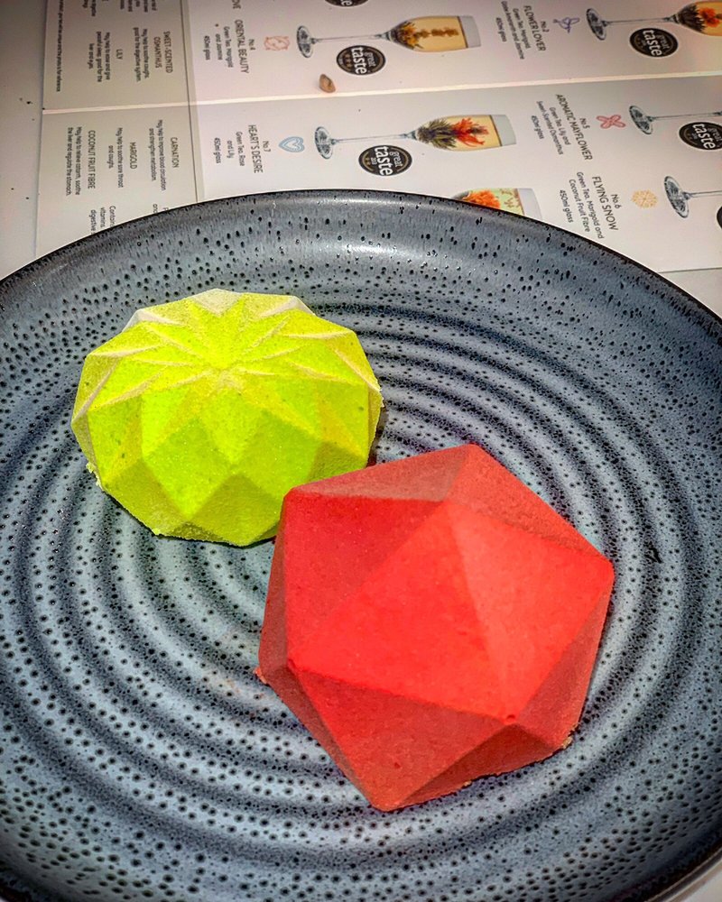 Lemon mousse, raspberry coulis, vanilla crunch, orange sponge.Contains:Gluten, dairy, eggs, gelatin (fish), soy.